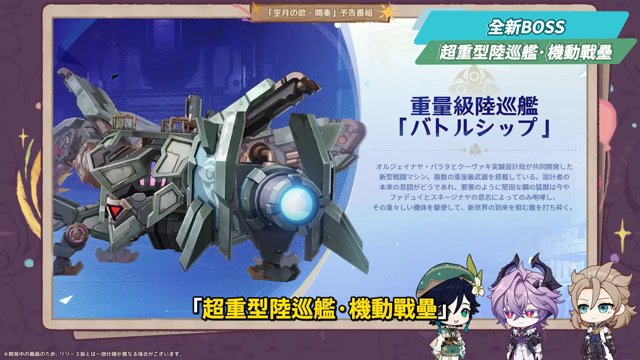 月之三版本也會新增全新的野外BOSS-「超重型陸巡艦·機動戰壘」,也是愚人眾的新造物,武器像是具備一邊火元素、一邊冰元素的攻擊型態,擊敗該BOSS,也可以獲得杜林的相關突破材料。