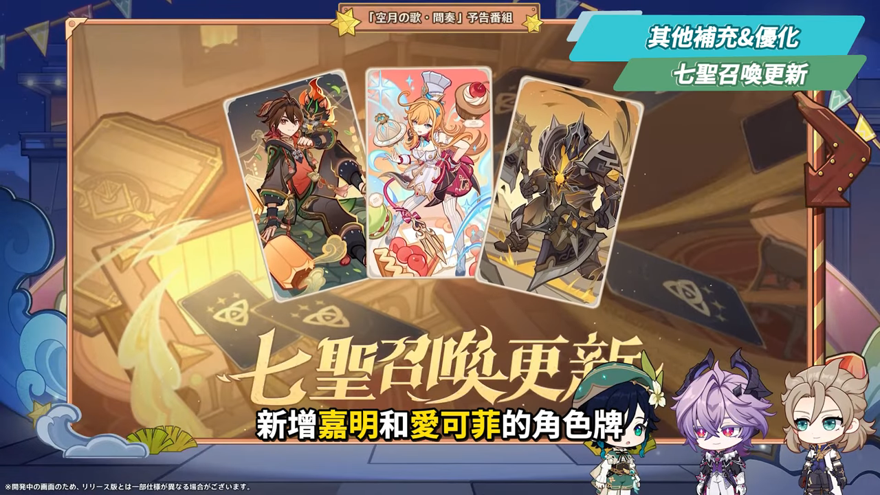 七聖召喚也會在月之三版本新增嘉明和愛可菲的角色牌,以及岩·黑蛇騎士與多張行動牌。
