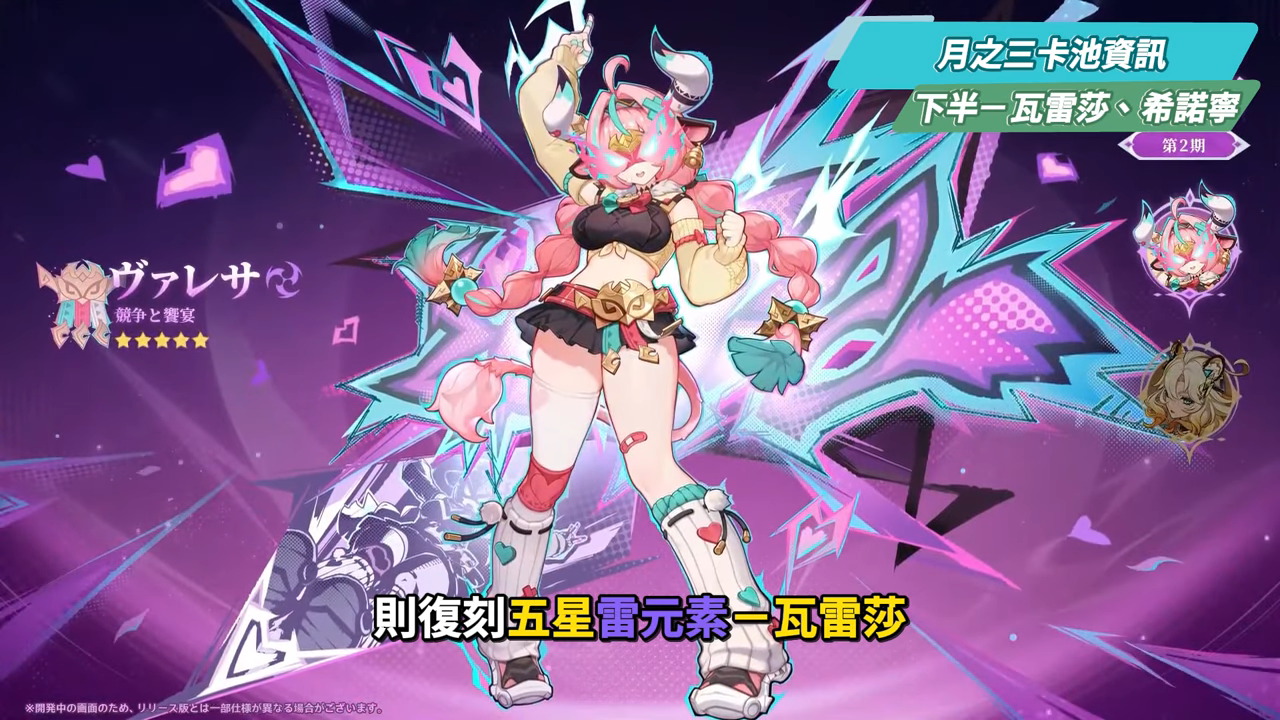 下半卡池則復刻五星雷元素-瓦雷莎,以及五星岩元素-希諾寧。以及兩位角色的專武同步於武器池復刻。