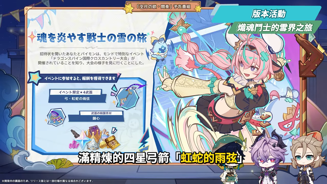 在版本活動「熾魂鬥士的雪界之旅」中,我們將回到久違的龍脊雪山,來參加這邊的「龍脊雪山國際越野賽」,這裡不僅有刺激的競賽,甚至還有一本八重堂的漫畫,似乎和比賽也有著某種聯繫?在接力賽舉辦期間,也會有多支來自不同地方的隊伍參賽,因此也會看到許多過去我們所結識到的老朋友們,加入到為比賽訂製的訓練計劃中。完成活動還能獲得免費滿精煉的四星弓箭「虹蛇的雨弦」。