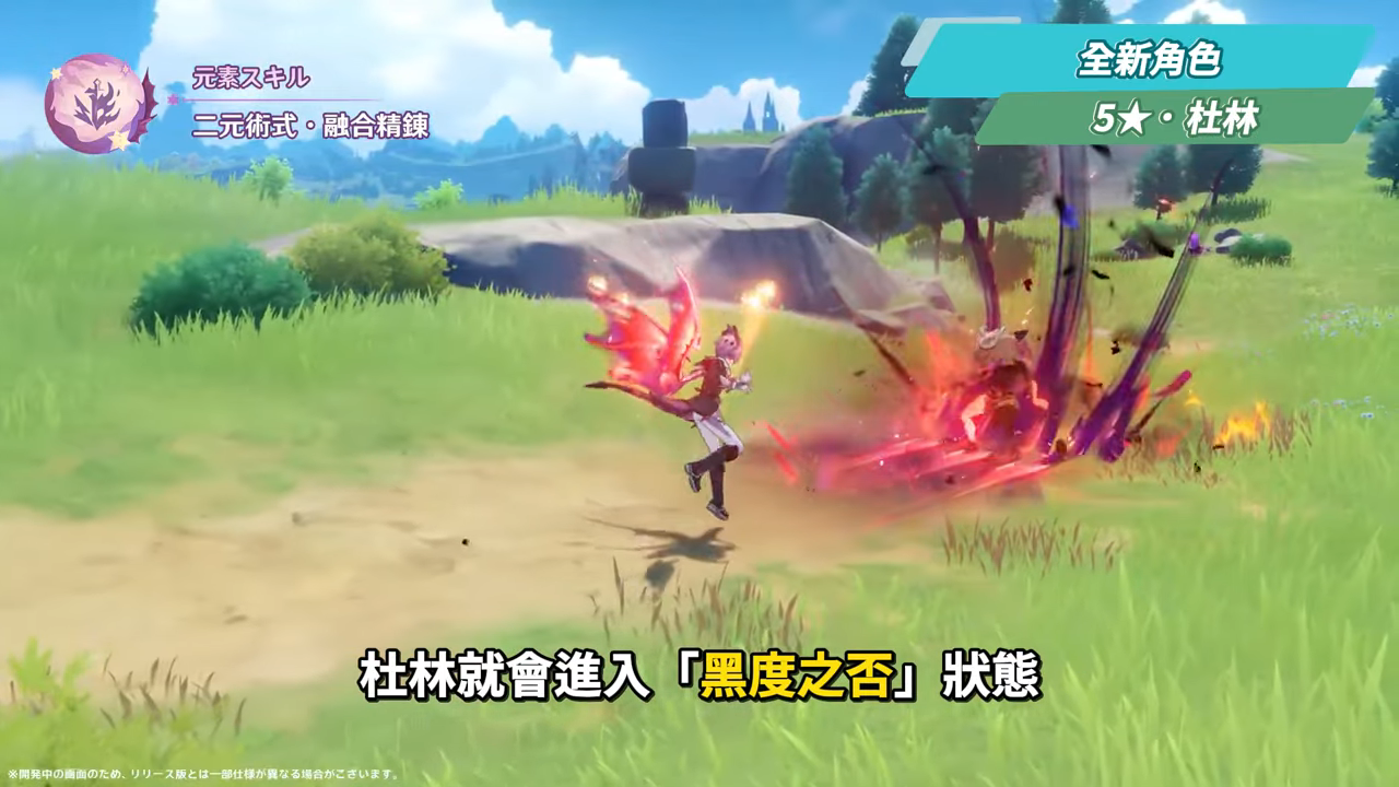 在杜林的體內隱藏著深淵的力量,而這股力量也是源自於魔龍的血肉,這也會讓杜林身上散發一些小動物不敢靠近的危險氣息。而杜林身上不僅擁有深淵的力量,也有來自童話中的力量,這也就讓杜林擁有了雙型態的戰鬥能力。像是施放元素戰技時,就可以自由選擇使用杜林2種力量的其一,類似於妮露的使用方法,若是點按普攻,也就是E+A,杜林就會進入「黑度之否」狀態,也可以看成是「黑龍」狀態,偏向於輸出型態,可以在開大後提高杜林自己的蒸發與融化反應傷害,並間歇性提供後台火元素,對周圍一名單體敵人造成傷害。而若是施放元素戰技後,再次點按元素戰技,也就是E+E,杜林會進入「白化之是」狀態,也可以看成是「白龍」狀態,會更加注重輔助隊友的型態,後續開大後,杜林的掛火就會轉為間歇範圍性掛火,有些類似滿命瑪薇卡的死亡摩托車轟炸,不同的是杜林的掛火還會降低場上敵人的火元素抗性,並且搭配觸發相關元素反應後,能再獲得對應元素的減抗效果,也就是只要能和火元素反應的元素,也都可以獲得對應減抗。