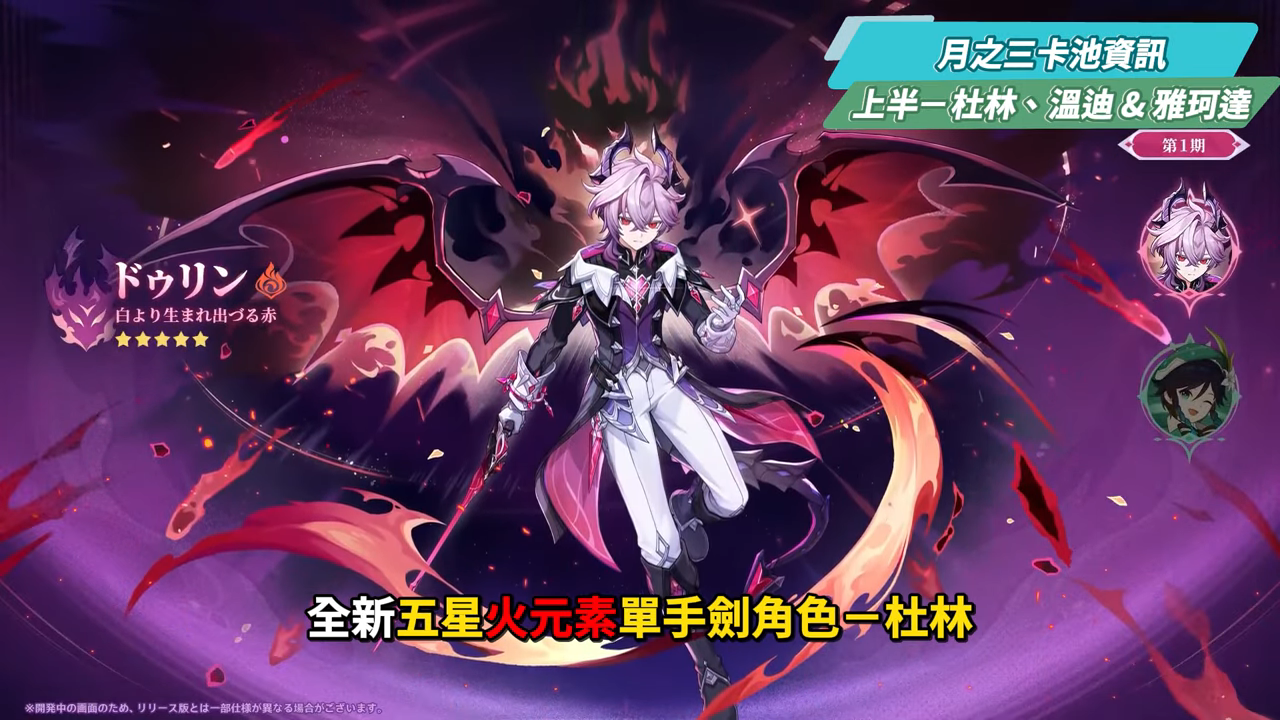 在上半卡池中,將會實裝全新五星火元素單手劍角色-杜林,以及復刻風神-溫迪。可以說是一個魔女會卡池。雅珂達也會在上半卡池中陪跑。
