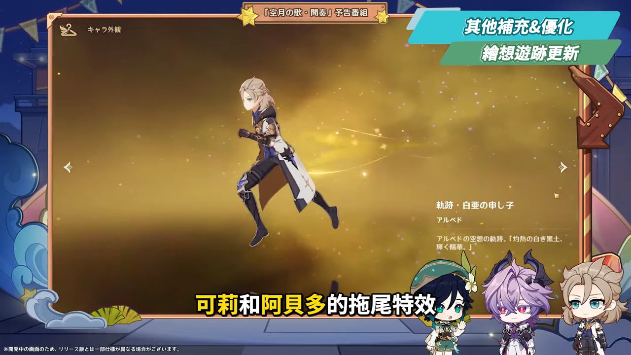 「繪想遊跡」也新增了可莉和阿貝多的拖尾特效,可莉的遊跡是象徵幸運的四葉草,阿貝多的則是陽華特有的花紋。