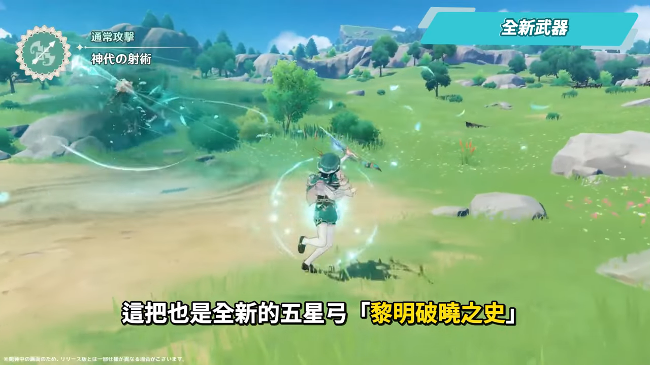 而在前面的片段中,也可以發現到溫迪手上的武器也不一樣了,這把也是全新的五星弓「黎明破曉之史」,上面也點綴了塞西莉亞花,相當契合溫迪外型的武器。