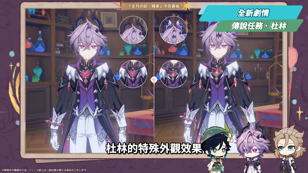 杜林也是先前4.8版本夏日限時活動中出現的角色,為魔女M在童話之書筆下誕生的龍,在初期還只是一隻**的模樣,而後在5.6版本的間章中,憑藉著神奇阿貝多和萬能煉金術的力量,才讓杜林成為了人的型態。在挪德卡萊與獵月人的戰鬥中,杜林也是成長為可靠的夥伴。在杜林的傳說任務中,我們將會和杜林一同認識更多的提瓦特世界,杜林也會從艾莉絲那邊,了解到關於母親魔女M的遺願,並且艾莉絲以及莫娜的師傅-魔女B,也會出現在杜林的這段故事中。這次劇情也有較為特別的體驗環節,像是可以讓旅行者多次出入的特殊空間,並且在限定時間內完成杜林的傳說任務,也可以獲得原石、以及杜林的相關突破素材獎勵。最後甚至還有杜林的特殊外觀效果可以獲取哦,從畫面上看頭上的角似乎發光了呢,胸口前的寶石似乎也發亮了起來。