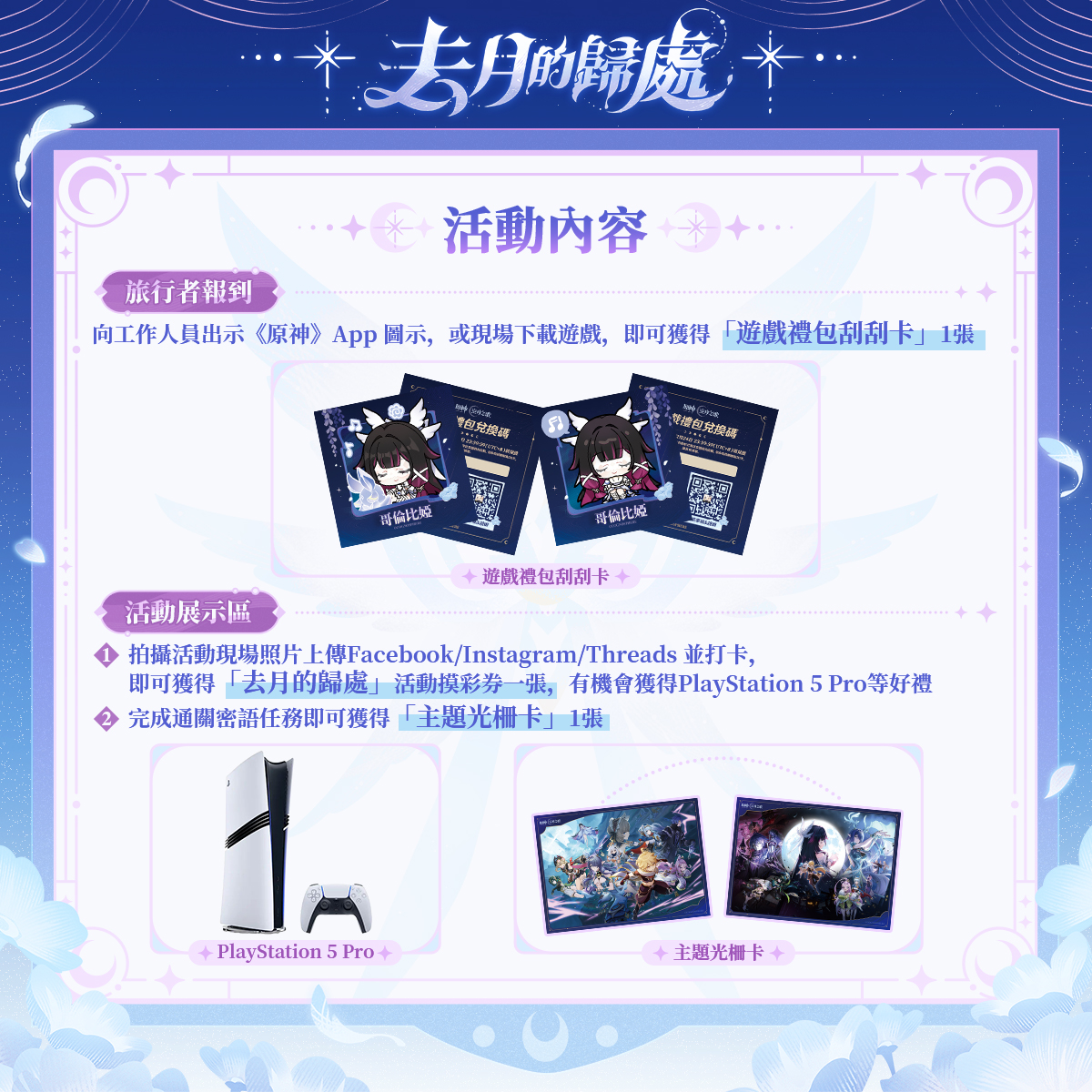 ✦銀月之庭體驗區:活動期間現場將展示「銀月之庭」裝置藝術,完成打卡任務,即可獲得抽獎券1張,旅行者有機會抽中PS5 Pro 等好禮