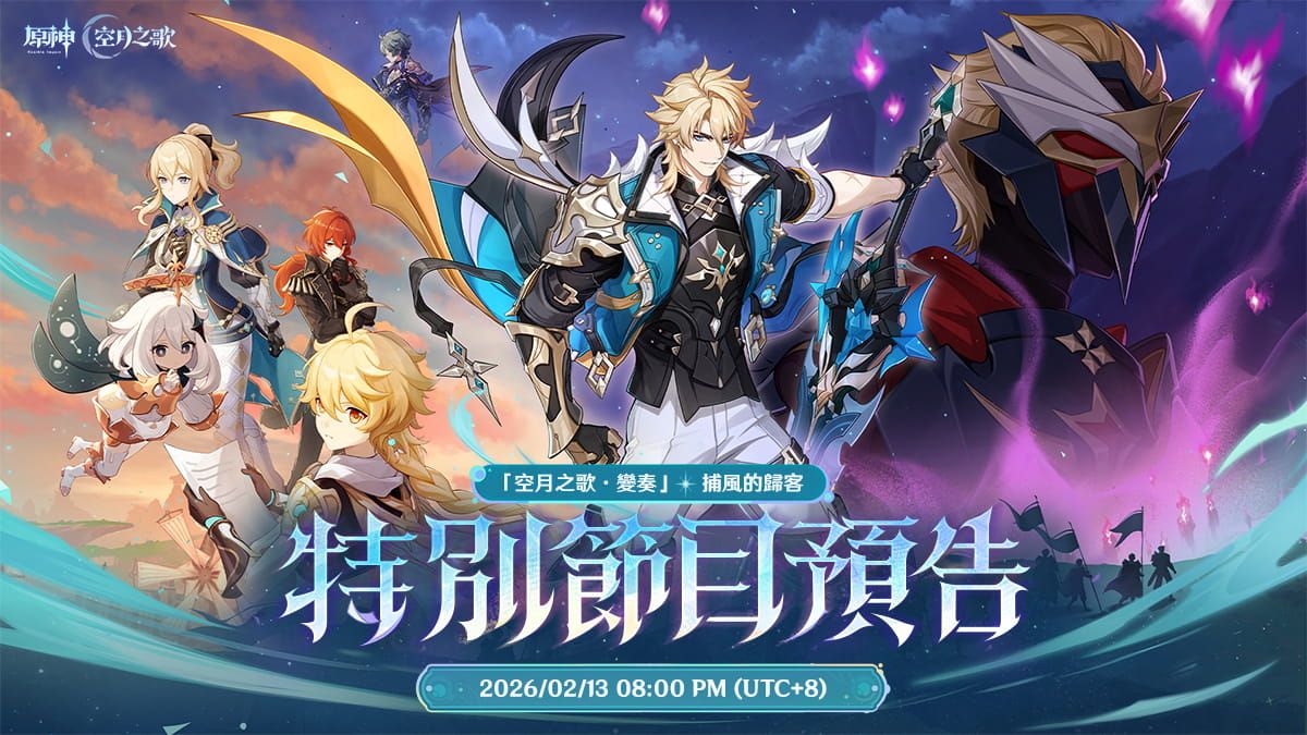 《原神》新版本特別節目將於2026/2/13 08:00 PM(UTC+8)在官方Twitch與YouTube頻道開播。