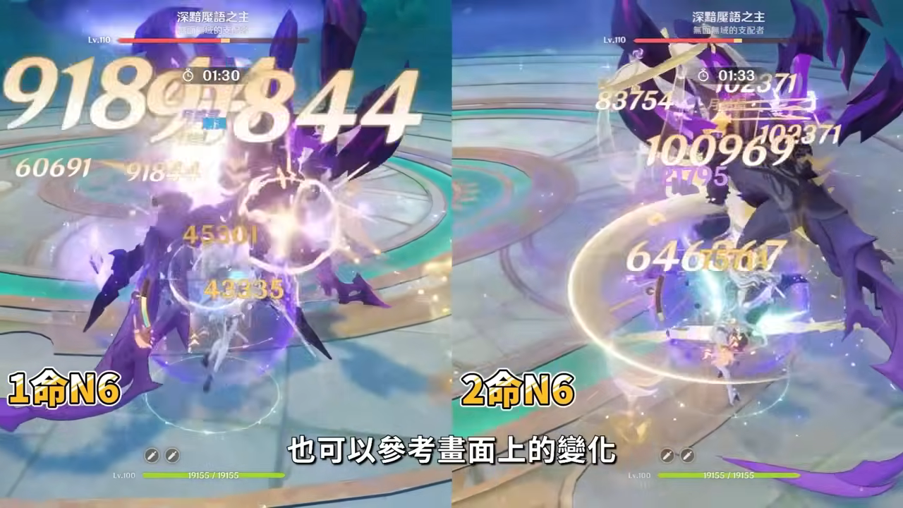 解鎖2命後,茲白進入E狀態,可以提高全隊角色造成的月結晶傷害30%,因此搭配少女時就可以也讓少女的月結晶傷害提高,甚至是未來的其他月結晶反應隊友。此外2命另外一個效果是使滿輝等級下「白駒E」的傷害再進一步提高,從原來的防禦60%提高至550%,具體提升傷害的差異,也可以參考畫面上的變化,至少有20%以上的傷害提升,也是一個兼顧自身輸出與團隊輔助效果的核心命座。