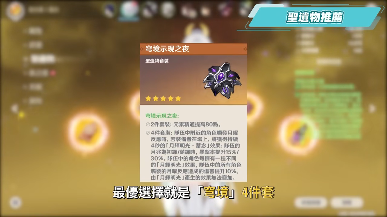 茲白的聖遺物選擇方面也十分簡單,作為月反應的站場主C,最優選擇就是「穹境」4件套,其餘的選擇則可以是「華館」4件套,雖然不能提高月反應傷害,但能提高防禦的效果還是比較少的,因此算是過渡期使用套裝。
