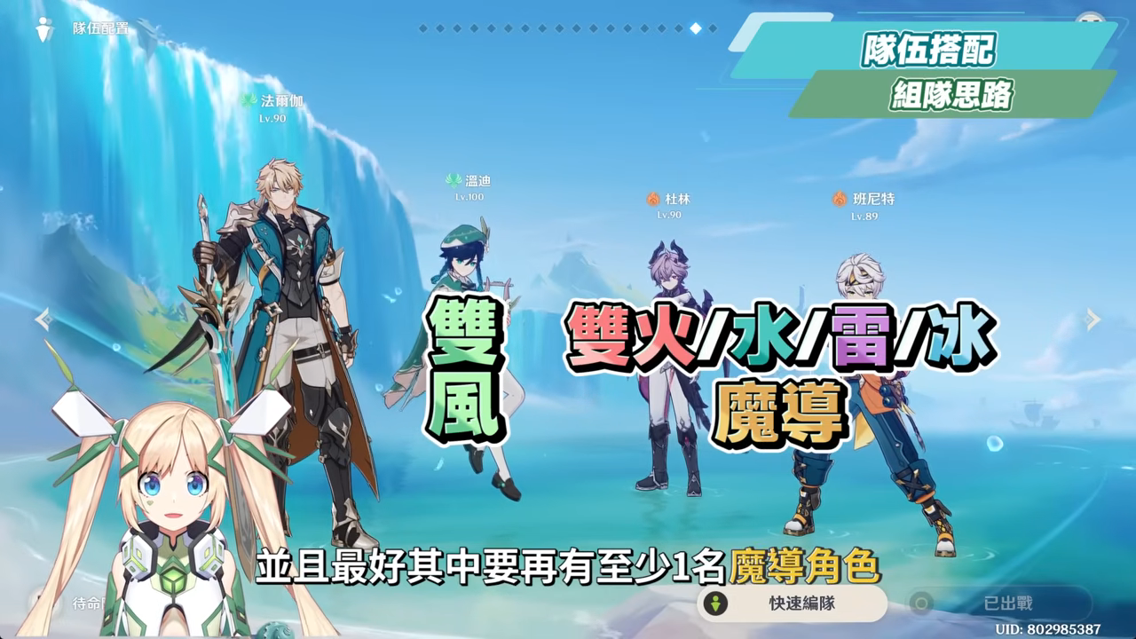 最後就是直接再組入萬金油滿輝少機隊,哦~我是說少女+伊涅芙,這對滿輝月感電自動後台**機,再搭配法爾伽與溫迪的雙風酒鬼組合,雖然沒有吃滿雙元素的特殊攻擊倍率上限,但在一些需要月反應應對的機制怪環境時,也有很不錯的實戰發揮,而且大家都能打輸出,也有一定的護盾維持法爾伽的站場手感,實戰體驗下來也很不錯。
