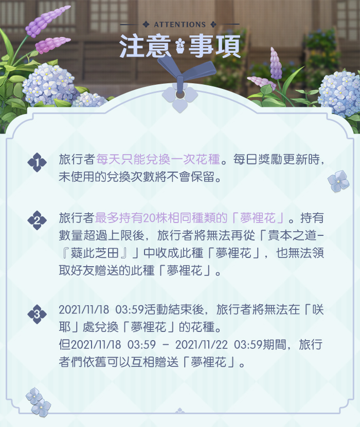 花種兌換時間:2021/11/12 10:00 – 2021/11/18 03:59 (伺服器時間)
