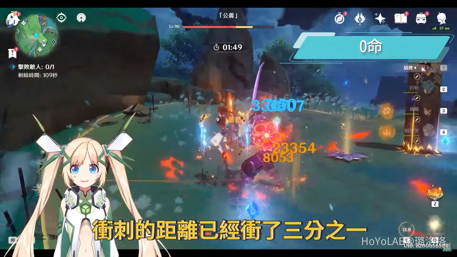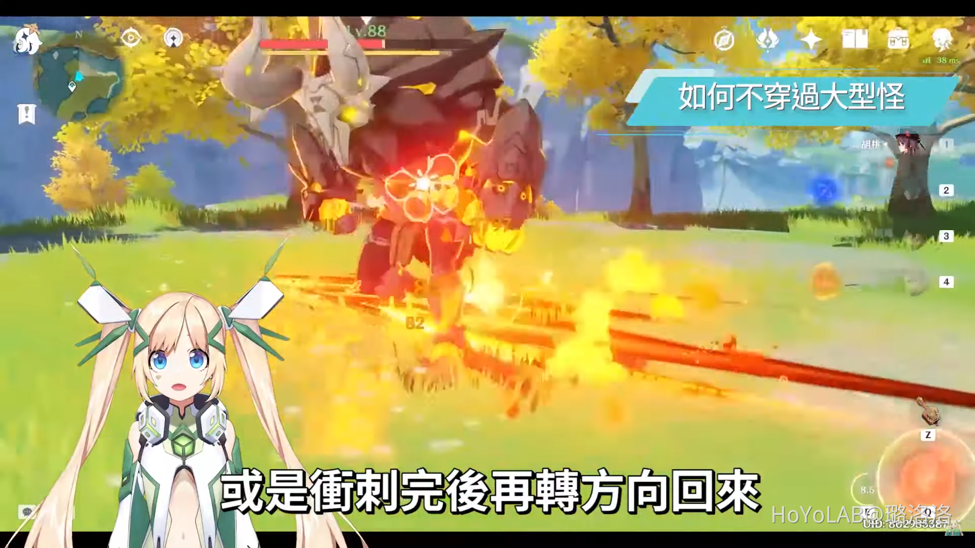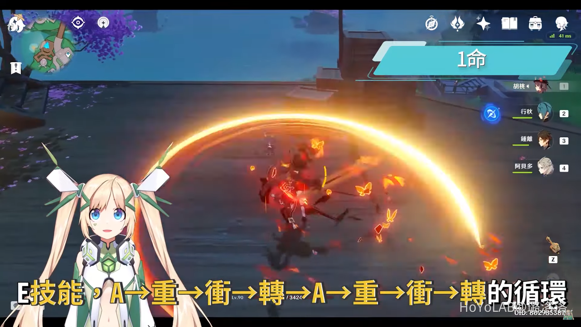 正確的方式應該是在衝刺的距離已經衝了三分之一或是一半的時候就可以按跳取消後搖,若是這個部分已經熟練的話,接下來要練的就是不斷的重擊Combo,E技能後,A→重→跳→轉→A→重→跳→轉的循環,洛洛這邊再加入了一個轉的口訣,因為在實戰中我們可能會面對大型敵人,或是要衝進被聚集在一起的敵人群體打架,這個轉就是要用來調整方向再讓胡桃的攻擊可以命中敵人,也因為遊戲中的AI在超出一個範圍後,就不會自動幫我們鎖定敵人,所以得靠自己手動來轉視角調整到正確的攻擊方向。