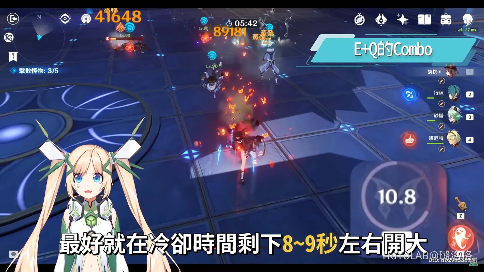 這裡也要順便補充一下胡桃E+Q的Combo怎麼放比較好,胡桃的Q大招傷害非常高,同時也是可以讓胡桃回血再續戰的一個重要技能,在E技能血梅香施放後,胡桃進行一連串的站場輸出,血梅香的持續時間為8秒,在此同時我們要注意一下右下角的技能冷卻時間,血梅香冷卻時間總長為16秒,大招最好的施放時機就是在血梅香加攻的時間內施放,打完一輪重擊下來壓血也好了,最好就在冷卻時間剩下8~9秒左右開大,而不要低於這個時間底限才開大,否則這樣大招就吃不到血梅香的加攻效果,也無法打出核爆傷害。開大之後胡桃剛好又回血,又可以再戰三百回合,或是切其他角色出來做BUFF,等到做完BUFF後胡桃E技能冷卻時間又好了,就可以不斷的一直打輸出爆發循環。